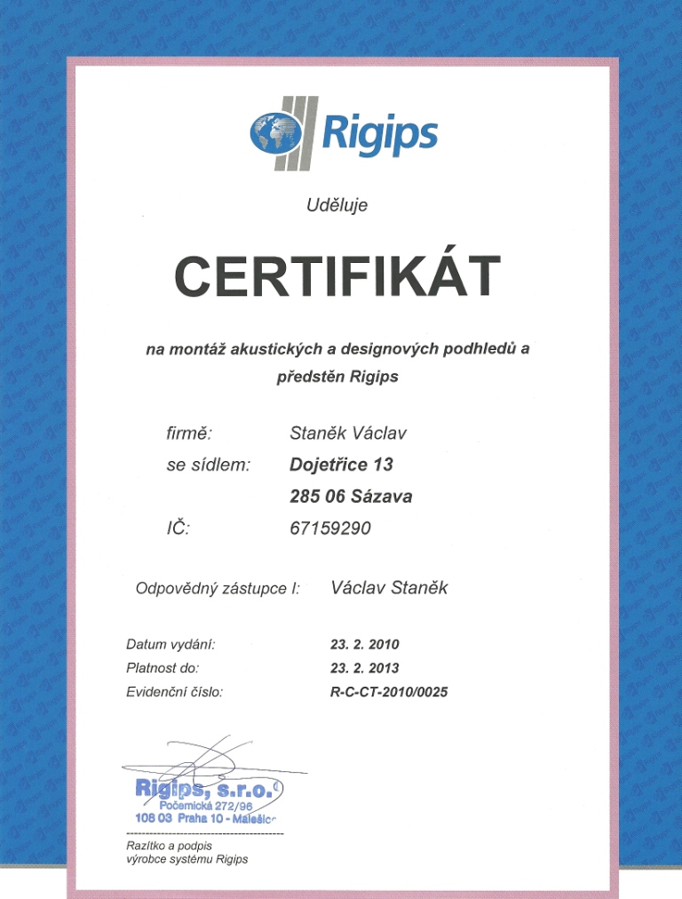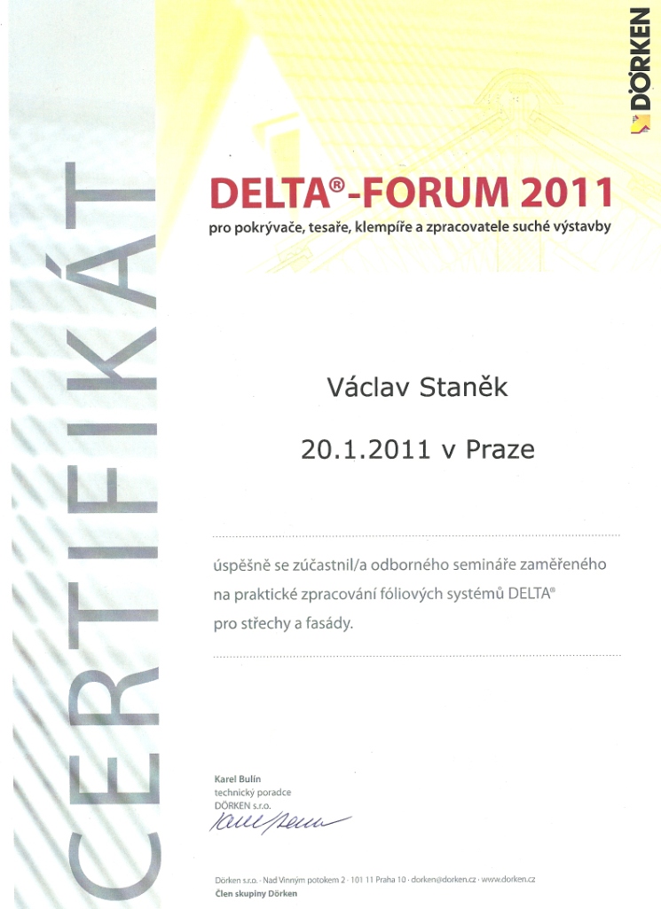 Naše firma, VÁCLAV STANĚK, zabývající se již od svého založení v roce 1998 (v podobě „fyzické osoby“) tesařskými, pokrývačskými a klempířskými pracemi, rozšířila v roce 2005 své působení také o komplexní dodávky a montáže sádrokartonových konstrukcí. Tím zkompletovala svoji nabídku v oblasti suché výstavby a staveb/rekonstrukcí střech na všechny řemeslné práce v této oblasti.